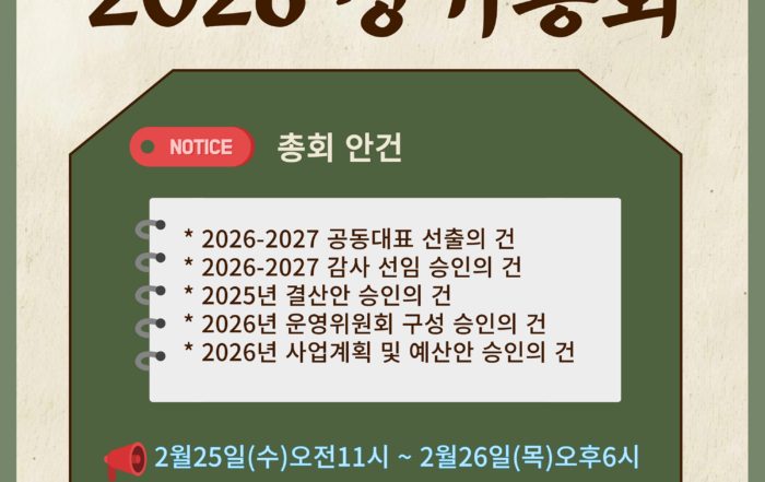 2026 서울KYC총회를 아래와 같이 공고합니다. -총회 기간 : 2026년 2월25일(수) 오전11시~2026년 2월26일(목) 오후6시 -총회 방법 : 온라인으로 진행(개인인증 후 참여) -총회 안건 (1) 2026-2027 공동대표 선출의 건 (2) 2026-2027 감사 선임 승인의 건 (3) 2025년 [...]