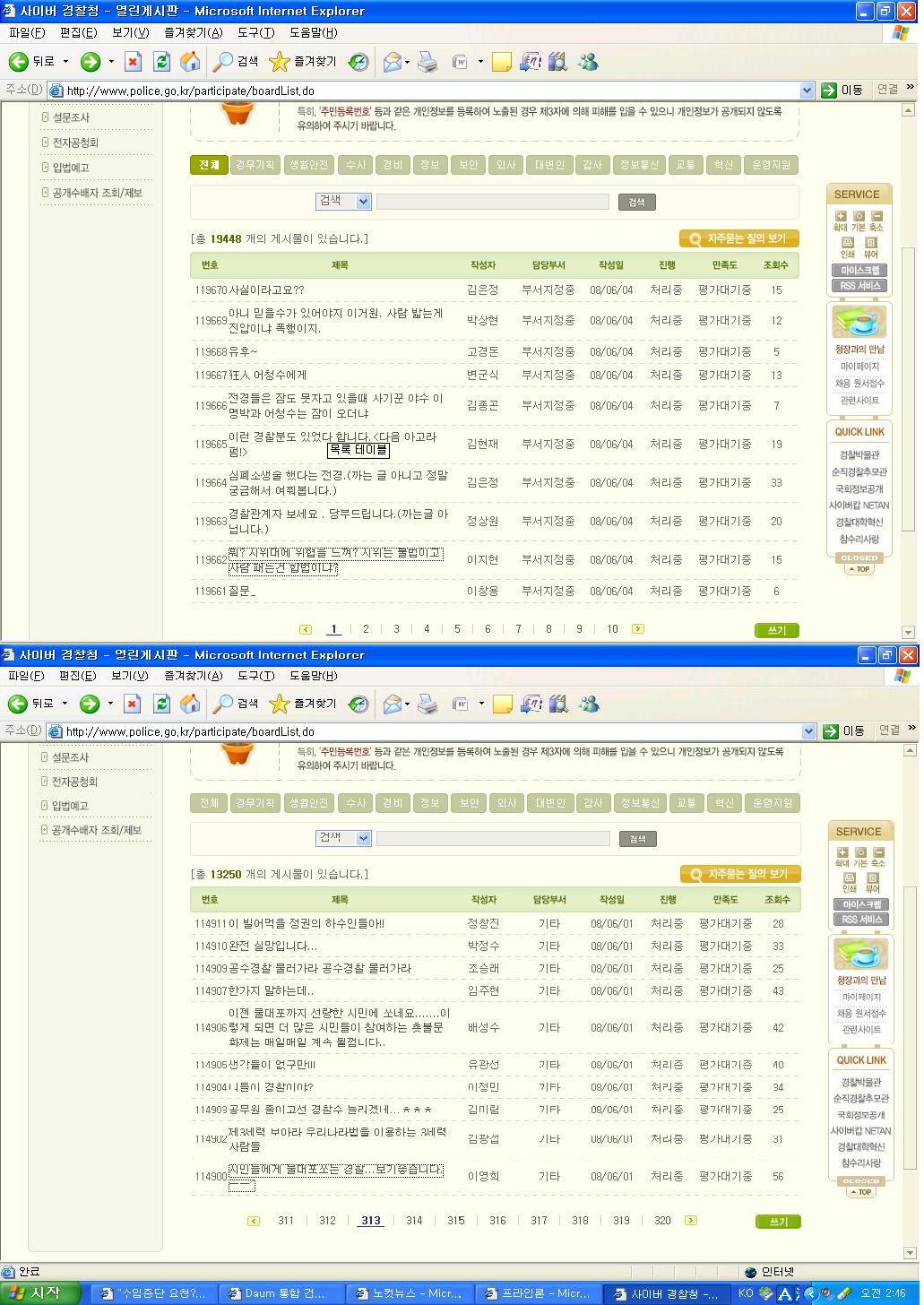 새벽에이곳저곳기웃거리다사이버경찰청도들어가봤는데.. 항의글이얼마나많은지한번확인해보고싶었으나.. 5분동안계속[>]만눌렀는데도끝이없어서포기했어요.. 313페이지부터가6월1일부터의글이시작되는곳이더군요.. (그림을클릭하면조금큰그림이보이네요)