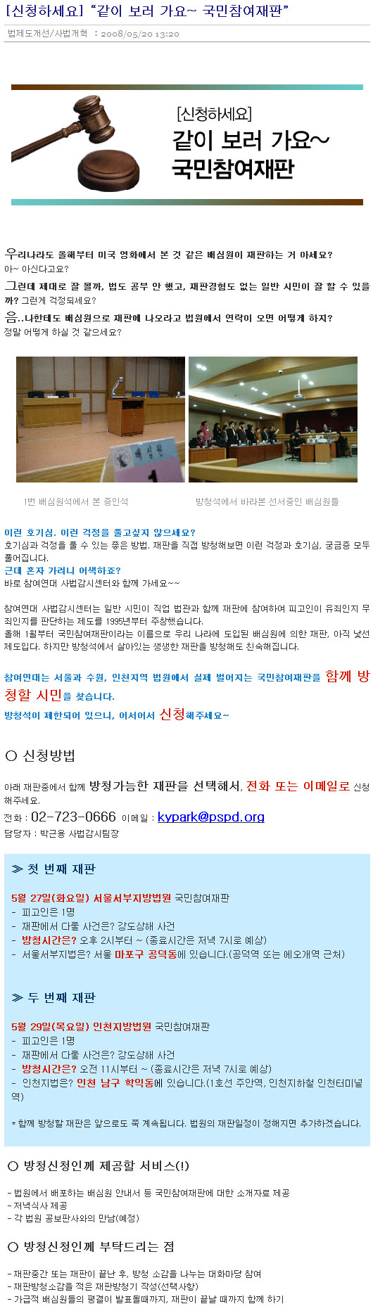************************************************************************** 참여연대에서 "국민참여재판 방청하기"를 하고 있네요. 관심 있으신 분들은 신청해 [...]
