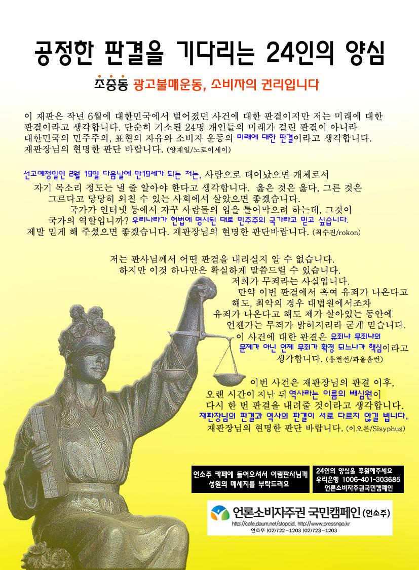 안녕하세요, 언론소비자주권국민캠페인입니다. 아시겠지만, 지난 여름부터 조중동 광고주 지면불매운동으로 재판중에 있는 [...]