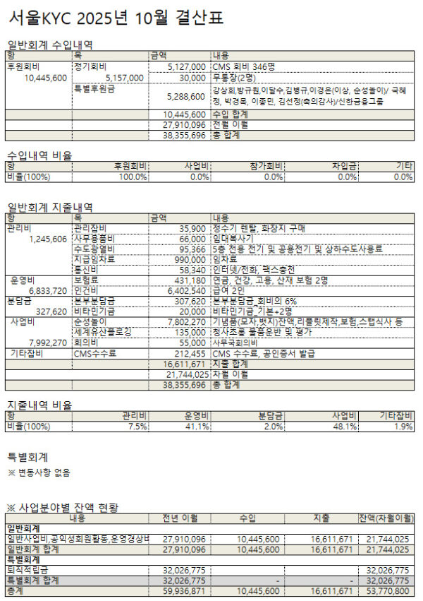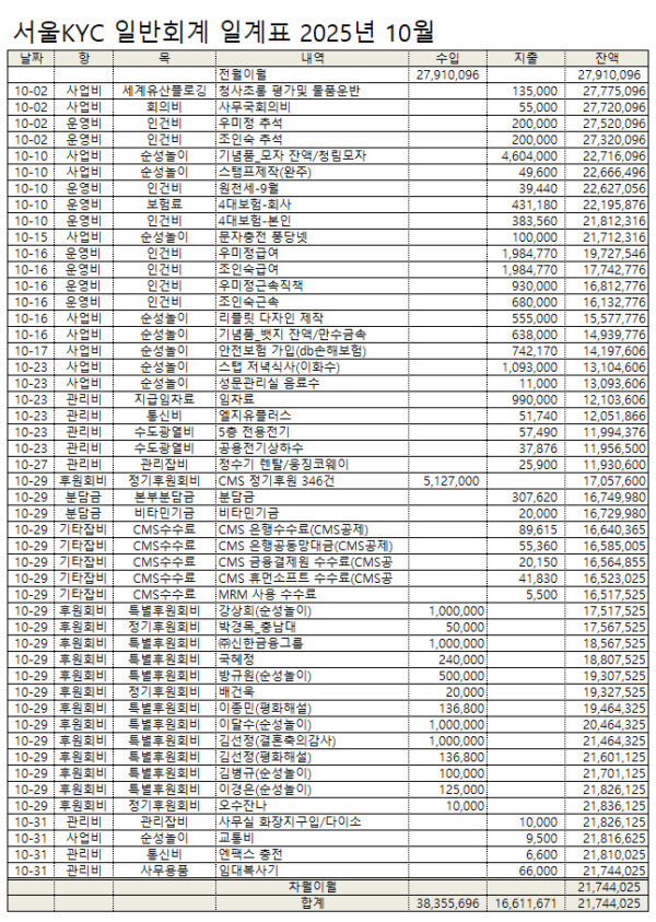 2025년 10월 서울KYC를 후원해주신 회원 명단입니다.