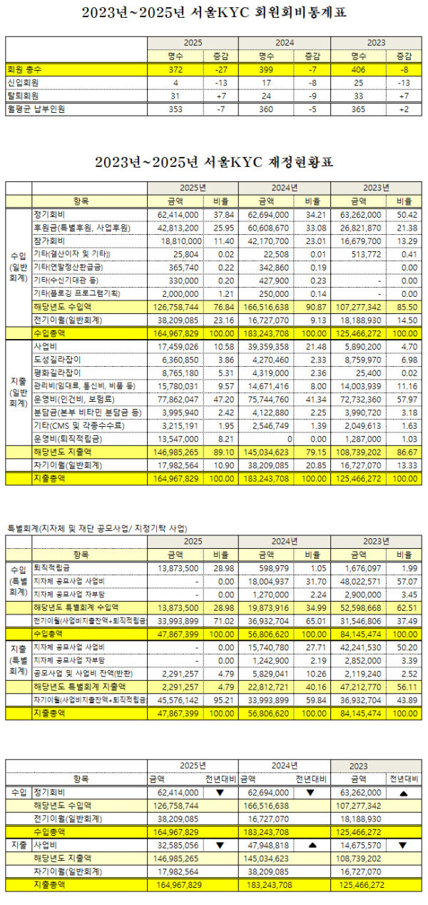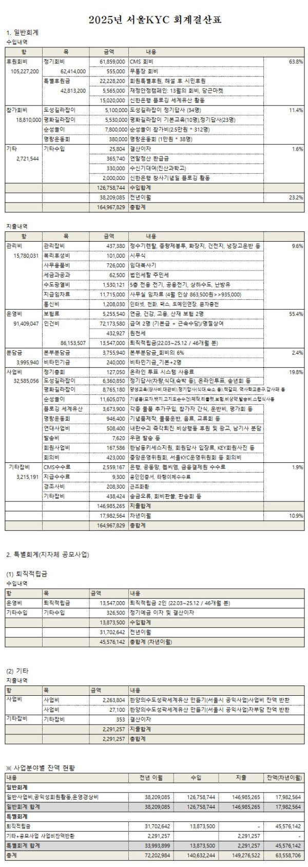 2026 서울KYC 정기총회 (2월25일~26일)을 통해 승인된 2025년 회계 결산 내역입니다.