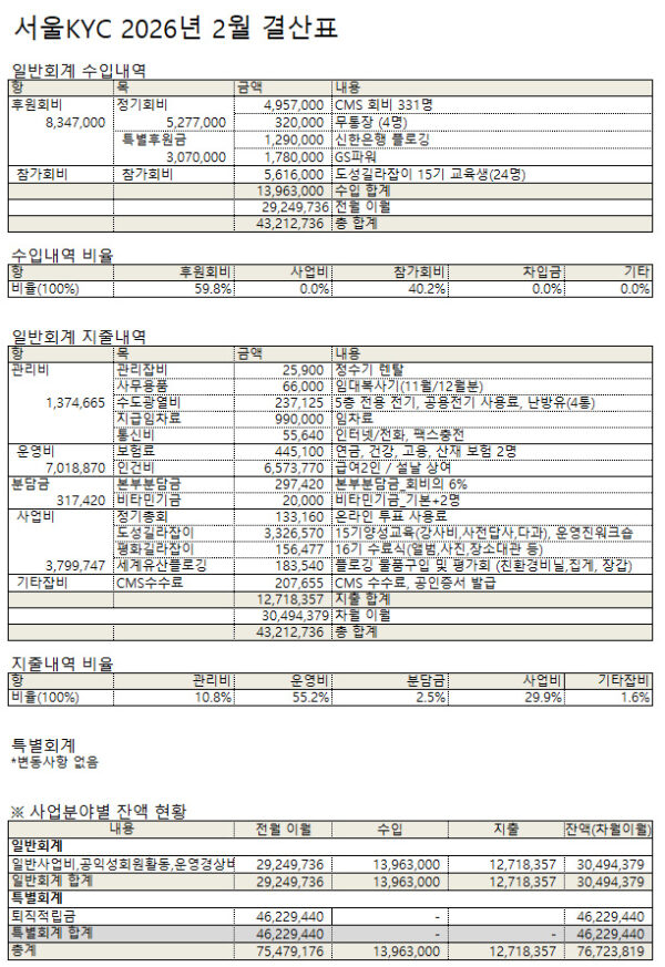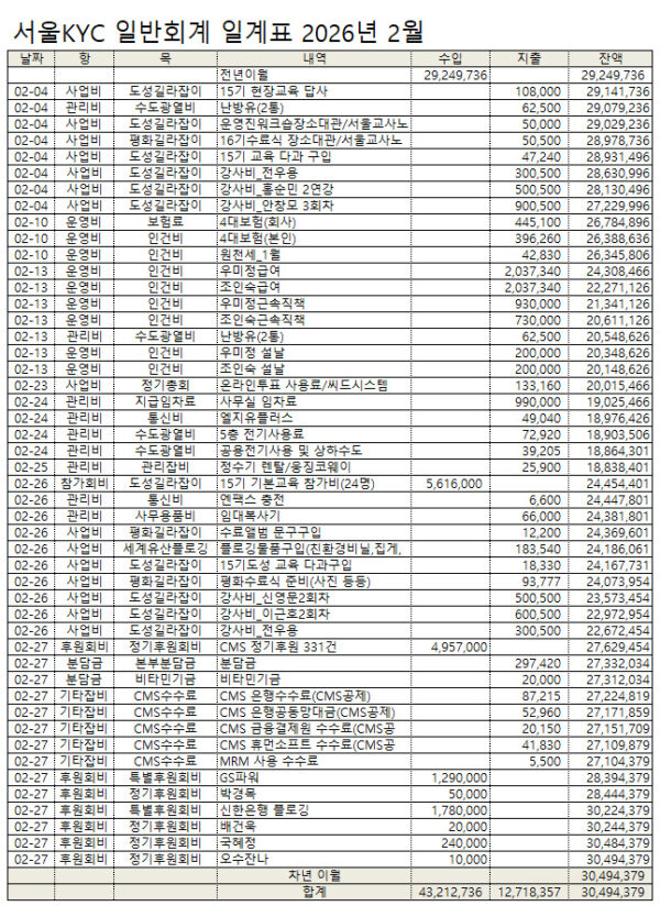 2026년 2월 서울KYC를 후원해주신 회원 명단입니다.