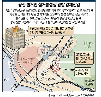 (서울=연합뉴스) 박성민 기자 = 경찰이 농성중이던 용산 철거민들을 진압하는 과정에서 최소 4명의 철거민이 사망하는 참사가 발생했다.