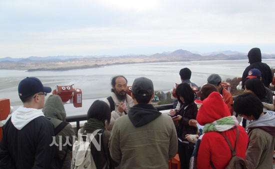 ↑ ⓒ KYC ‘평화길라잡이’ 수강생들이 경기도 오두산 통일전망대에서 사진가 이시우씨 강의를 듣고 있다.