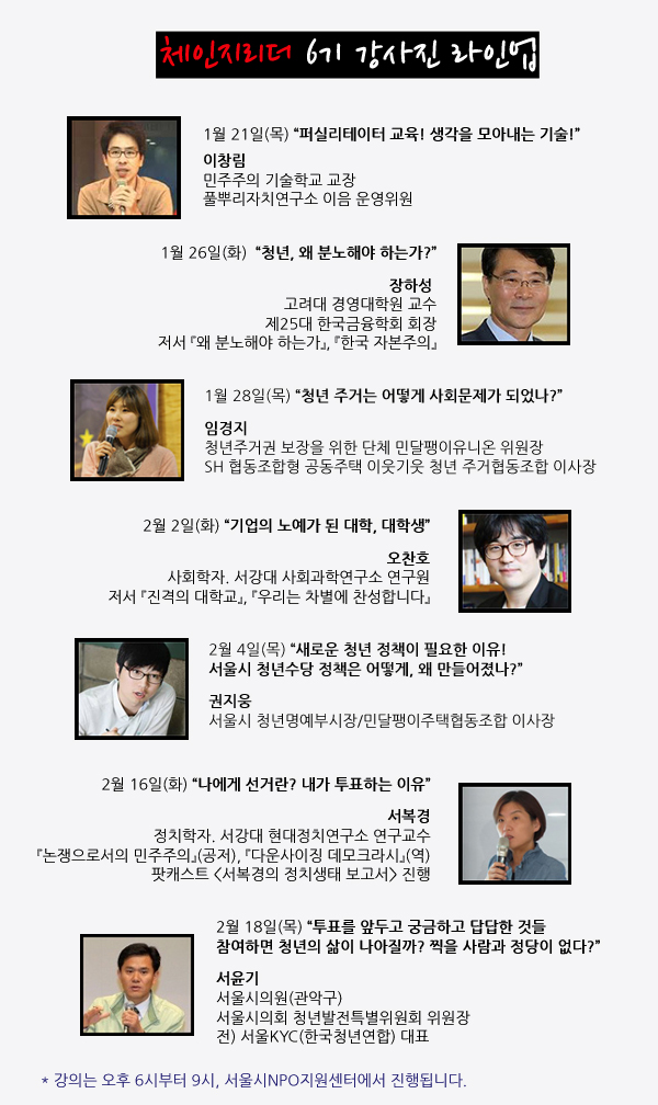 – 2016 체인지리더 6기는 더 나은 청년들의 삶을 만들기 위해 학습하고 행동하는 청년활동가입니다.